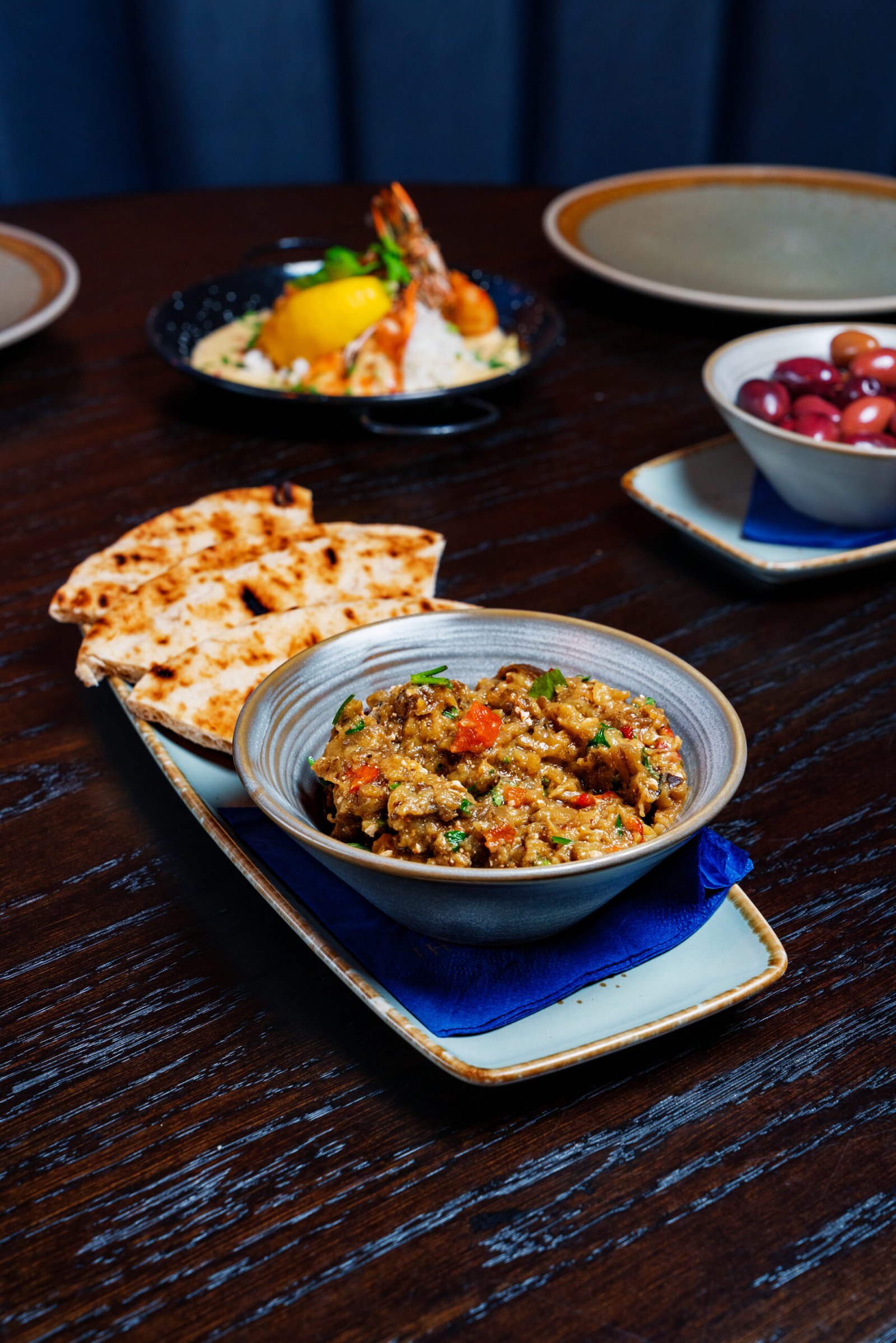 A light and fragrant blend of smoked aubergine mixed with feta cheese, garlic, dill, olive oil, oregano, and roasted red peppers, served with pitta bread.